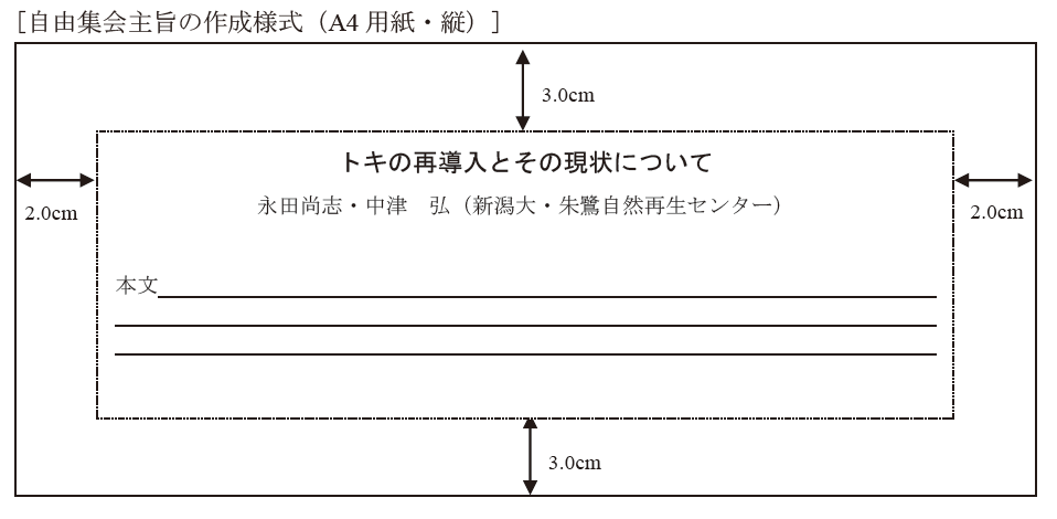 1行目には集会名,次の行に主催者氏名を,参加申込書に記入したものと一致するように書いて下さい.1行空けた後に本文を書いて下さい.本大会の講演要旨集はA4版で作成しますので,原稿がそのままの大きさで印刷されることを想定して,文字サイズ・レイアウトをお決め下さい.図表も使用できますがきれいに刷り上がらない場合があります.
