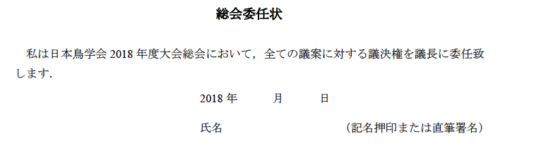 大会期間中に総会が開催され,学会の重要な議題が審議されます.大会に参加しない方は,日本鳥学会誌67巻1号の大会案内に印刷された総会委任状,あるいは下のイメージを印刷し記入し,大会事務局宛に郵送して下さい.大会に参加するが総会に出席しないという方も,総会委任状を大会事務局宛に郵送するか,大会当日受付でご提出下さい.総会委任状の用紙は大会当日受付,総合案内にも準備しますので,そこで記入・提出することもできます.